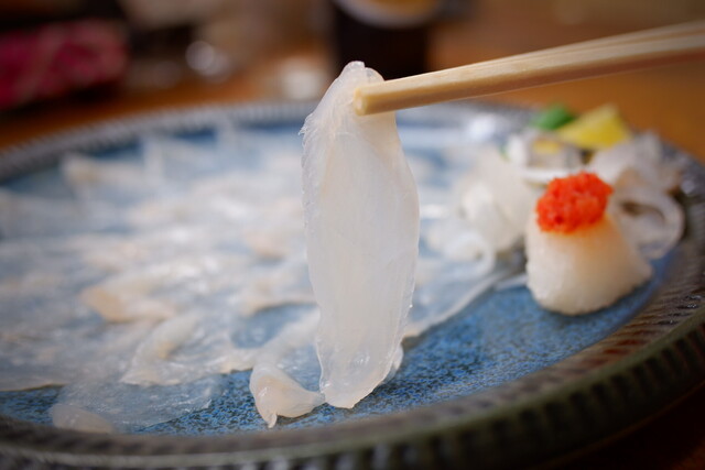 この日に揚がった天然物のトラフグ、何よりも強力な弾力や歯応えがたまらない。