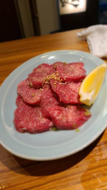まずはビールに豆もやしで肉を待ちます。一皿目は、生タン塩1,610円。特選以上にコストパフォーマンスの高さを感じられると思います。