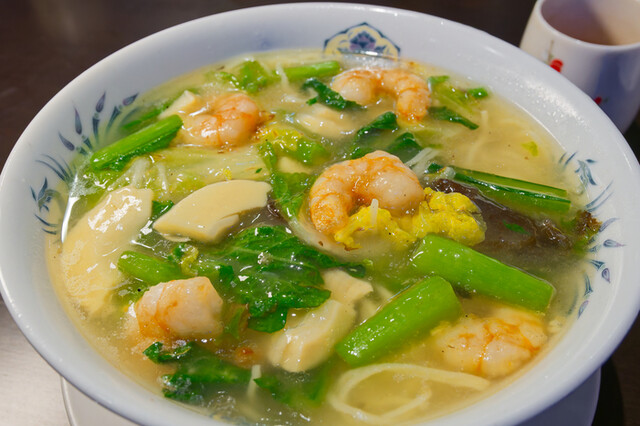 移転前より行きつけの中華料理店です。天津や飯物、麺類に至るまで、本場中国広東の味付けでの提供。本日は当店お薦めの海老そばを注文しました。贅沢に具材が椀を敷き詰め、海老出汁香るスープは完飲必至。単品でもボリュームがあり、満足度は極めて高いです。複雑に味が絡み合う、本場の味わいでした。