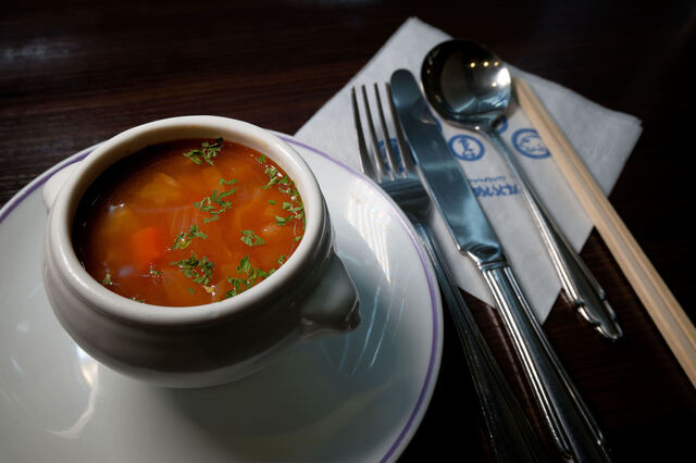 たいめいけんといえばやはりこのボルシチ。昔から変わらない100円メニューで、可愛らしい壺型の器に入って登場します。