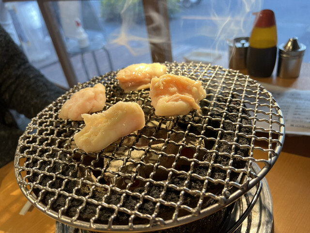 ホルモンの潮は、ポン酢もいっしょにきました!これも嬉しいー!大ぶりのホルモンは焼くのが少し難しいですね、最終的に七輪が火だらけ。でも、美味しく焼けました。大ちゃんは、あっさりめのホルモンで少し焦げ目がつくと味噌がいい感じの味になります。全体的にご飯が進む甘めの味わいなので、お子様が来ているのもうなづけました。