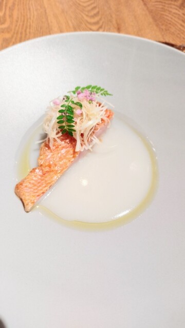 4. 鰆ポワレ白味噌を効かした白ワインのヴァンブランソース大根千枚漬け柚子香りスライスアクセントマイクロハーブセロリレモンバーベナルッコラの香りがいい感じ