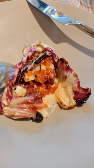 前者はイカ墨リゾットの歯触り食べ心地の複雑さと柔らかな甘酸っぱさ、ソテーされたイカの甘み食べ心地、とびっこのプチプチ感。セロリやトマトと合わせていただいたときの絶妙な味わいバランスがsioらしさ真骨頂といった感じがして、とても楽しめました☆
