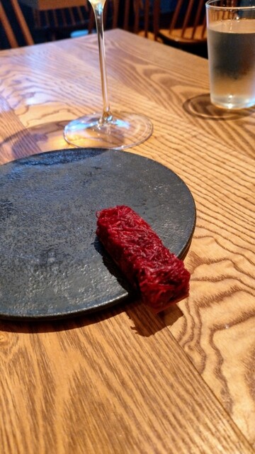 自家製食パンのラスク馬肉タルタルビーツのサラダ。こちらのスペシャリテ。ビーツサラダのやさしい甘みがかなり好き♡(๑´ڡ`๑)