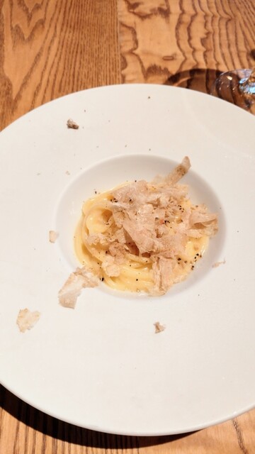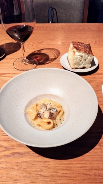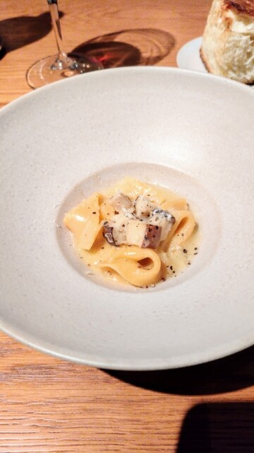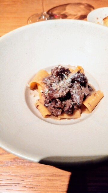 それからパスタ2種類、1つめのストリケッティは原木椎茸の旨みとトリュフオイルの香りで。旨みたっぷりのカチョエペペソースがしっかりパスタに絡んでいて香りが口の中に広がり、旨みが濃厚食べ応えあり美味。