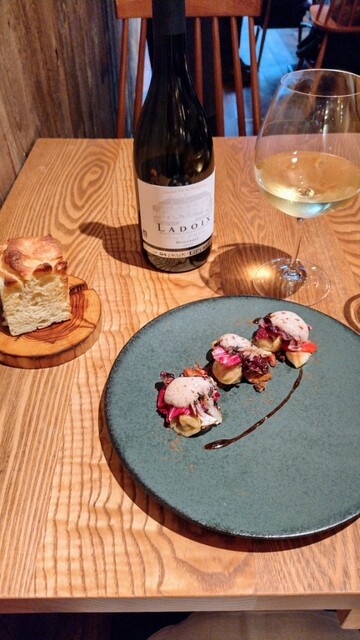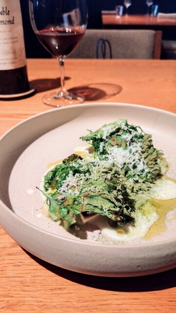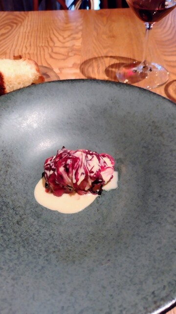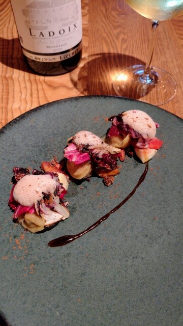 熟成じゃがいもコンテチーズラビオリセルバチコとアンチョビをイメージして鯖。白っぽいシャキシャキしたものの歯ざわりとセルバチコの風味と、鯖の旨みチーズのコクと。厚みあるラビオリじゃがいも甘みいろいろ美味