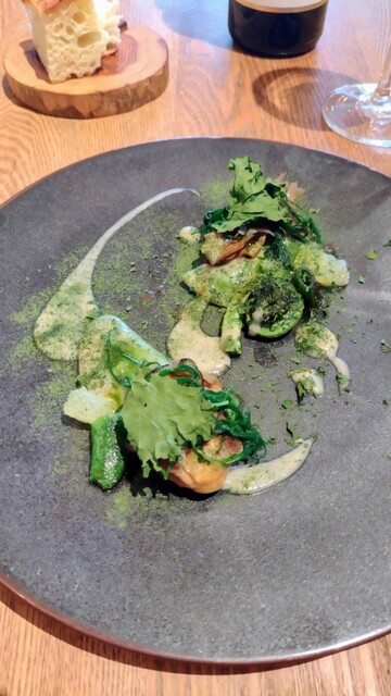 鯖一夜干しの前菜は、鯖一夜干しが燻製され焼かれているので薫香が香って新しい美味しさの一面を発見したような感覚がします。添えられお野菜やフルーツが5味+1 のバランスを作っていて、そうそうこの仕立ての絶妙さがsio の好きなところなのよねと、あらためて思ったのでした♡