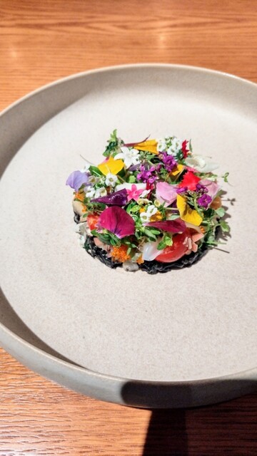 今回のお料理の中で特に印象強かったのは、エディブルフラワーに彩られたイカ墨リゾットサラダ仕立て的なお皿と明太子パスタです。