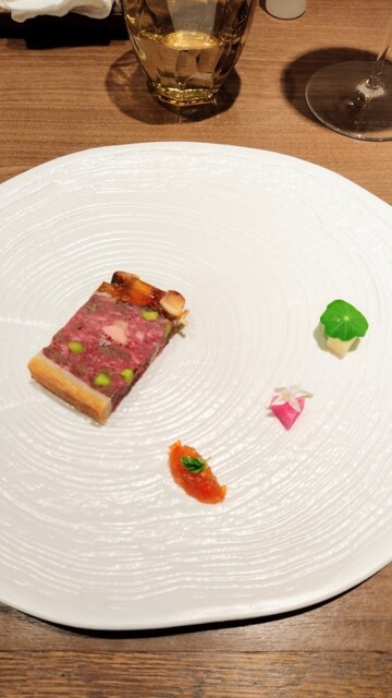 熊アナグマ鹿猪のパテアンクルート。見た目からいろいろなお肉がミックスされてるの分かります。ひと口ごと違う美味しさが楽しめ、コンフィチュールなど付け合せがアクセントになってとても楽しめました(*^^*)