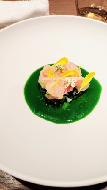 ・ヴァンタニエール鹿児島県産真鯛昆布締め菜の花わかめと旬のたけのこ柚子サラダの上ホタテと真鯛の出汁と菜の花ピュレソース菊とアリッサムトッピング