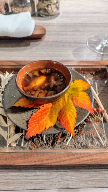 ・北海道帆立フリカッセ何かのベーコン3種類茸チュイル茸のパウダー森の中枯葉の中をサクサクと歩く音イメージして