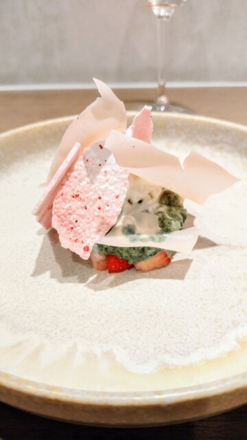 ・桜餅イメージ下から苺よもぎ風味のリオレ桜葉の香り移したアイスクリーム苺のメレンゲ桜とヨーグルトのチュイルピンクペッパー