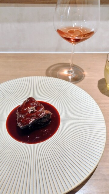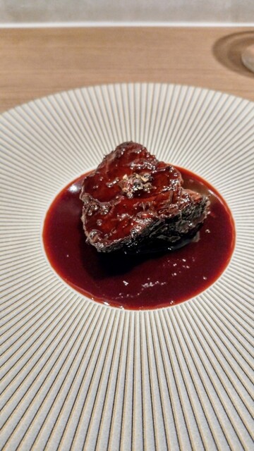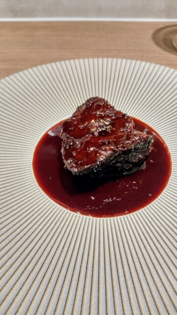 ・じっくり柔らかくなるまで煮込んだ牛ほほ肉赤ワイン煮込み(鹿と七谷鴨と宮崎県産牛もあったけれど珍しめのメニューで) 赤ワインの酸が感じられるような味つけだそう まろやか系というよりスパイス系に感じた