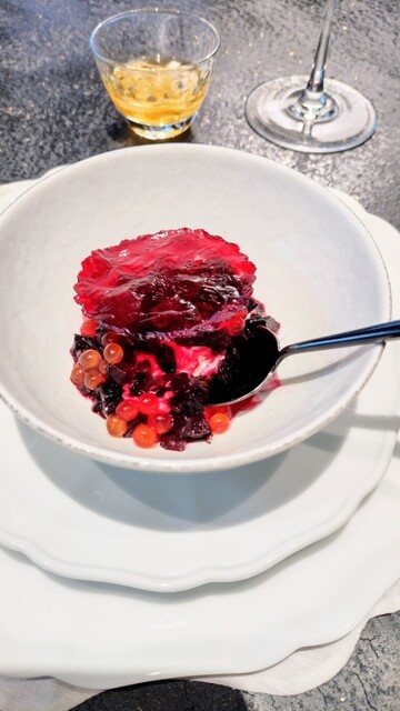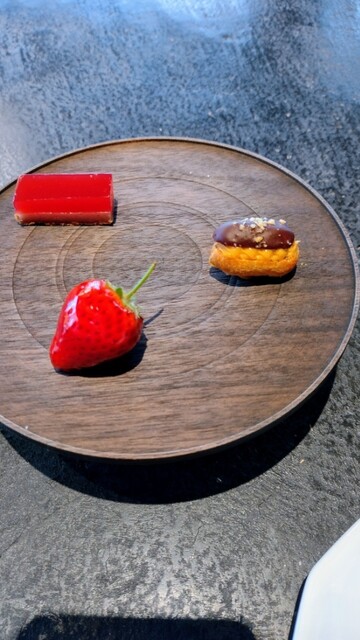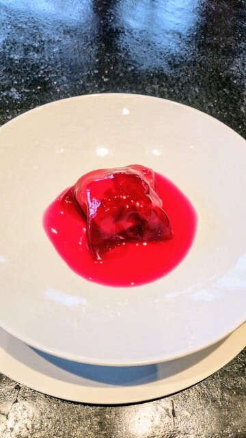 それから、赤紫蘇にホワイトチョコレートのムースというデザートも大好きでした。ホワイトチョコレートというだけで間違いないですけど、そこに合わせられた赤紫蘇の風味やルバーブコンフィチュールの風味歯触りが奥行きや広がりを作っているようで。大人っぽい感じも良かったです。
