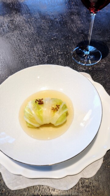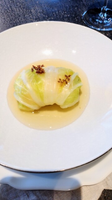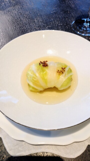 【白菜 Chinese Cabbage】‥発酵白菜鯵海苔大葉松の実発酵白菜で包んでフロマージュブランでコーティング上に自家製タラのでんぶ発酵白菜のスープと重湯のソース