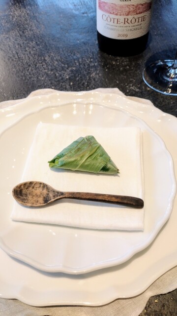 最初のアイスキャンディーのアミューズ、ほうじ茶に乗っての登場です。以前は緑の葉に乗せられていましたが、この時点では緑の葉は採れなくなってきたんだそうで。ほうじ茶が落葉のように感じられて、季節の移ろいにスタートからわぁ〜♡という気持ちになりました。