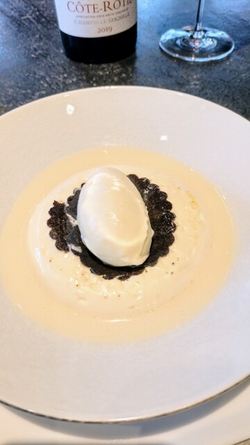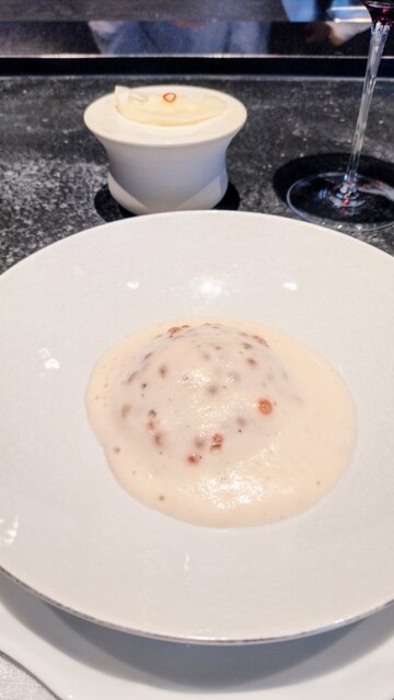 豆乳のお料理のごぼうのポタージュスープがやさしい甘み風味美味しくて、根セロリのお料理のセロリの香り白トリュフの香りも膨らんで。やっぱり素敵だ〜