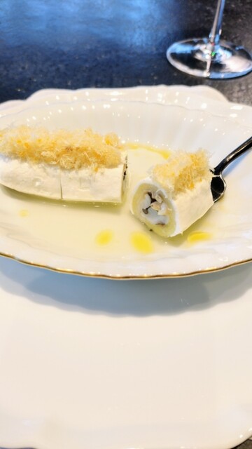 この日いちばん印象に残っているのは、兼ね合いのうずらのファルシです。じゃがいもがたくさん詰まっていてホクホク感とお肉のやさしい味わい、トッピングの和牛カルパッチョと大葉エゴマの葉が風味や旨みを増しています。そしてなんと言っても舞茸のまろやかなソースが全体をまるっとまとめて幸せな美味しさ♡♡ 舞い上がっちゃうお味でしたね