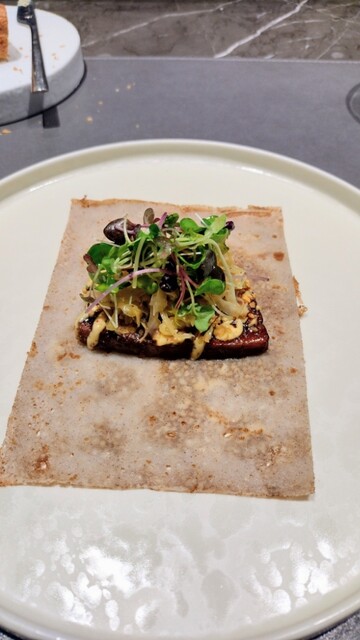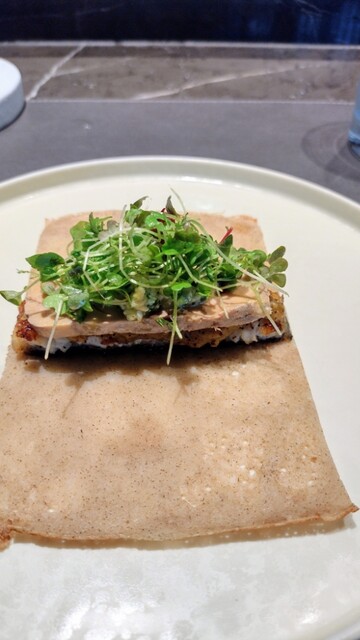 蕎麦粉のクレープと鰻のお料理。スタッフ皆さまが蕎麦の生産者さんを訪ねたことをきっかけに、伊吹蕎麦の香りからインスピレーションが湧き生まれたお料理だそう。香ばしくキャラメリゼされた鰻は蒲焼きのような甘辛にフォアグラのリッチな味わい、ハーブやソースでバランス良く。もちっと食感のクレープが破れずしっかりホールドして、一体となったお味を堪能できました☆