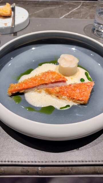 鰹藁焼きのお料理は、ソースのトリュフの香りに加えて、いわゆる南蛮漬けや油淋鶏のような甘酸っぱい感じのお味付けが私の好きなタイプ。やみつき的に手が止まらず、今日のコースこの後どうなってしまうのかしらと思うほど、没入感高まってきました。