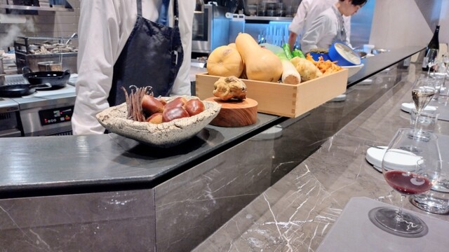 そして演出が素敵、規模の大きくない一斉スタートだからこそのエンターテインメント性あるプレゼンテーションがワクワク感を掻き立てます。お皿の提供でスタッフさんがタイミングを合わせて皆になされるとか、全体へ一斉にお料理の説明がされるとか。本日の食材が彩り豊かに並べられて丁寧に紹介され、香りを嗅がせていただけたり。お食事時間の進みにリズム感が感じられて、何だか自分もエンターテイメントに参加しているみたいな感覚。それがとても楽しかったです(^.^)
