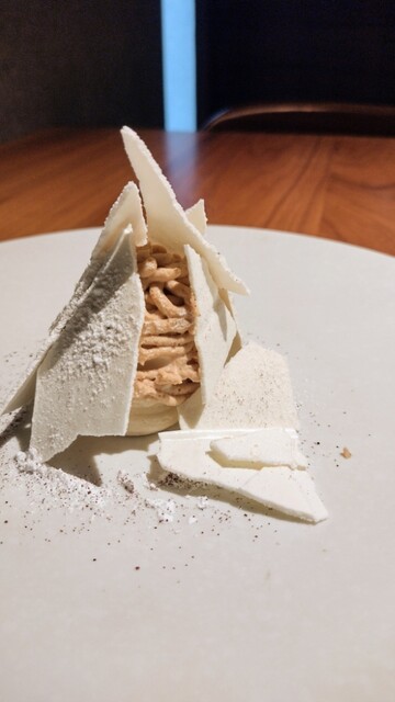 モンブランのデセールは、時期的に栗スイーツが話題に出てきたりして食べたい気持ちが高まっていたので、まず嬉しかったです♪ メレンゲ片で覆われたおしゃれな見た目のメレンゲを少し外すと、モンブランらしい見た目が現れたのもストライクな感じがあります。もともとモンブラン好きの私でもありますが、レストランデセールにドレスアップしたこの日のこちらが美味しく、素敵な気持ちになりました。