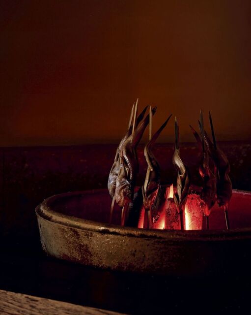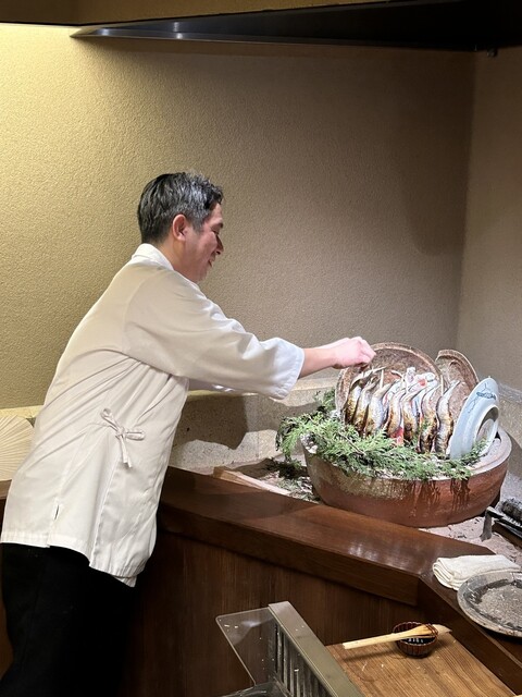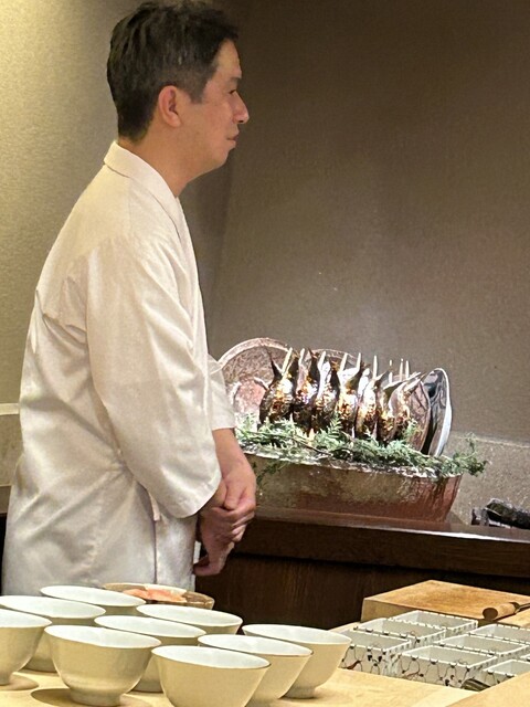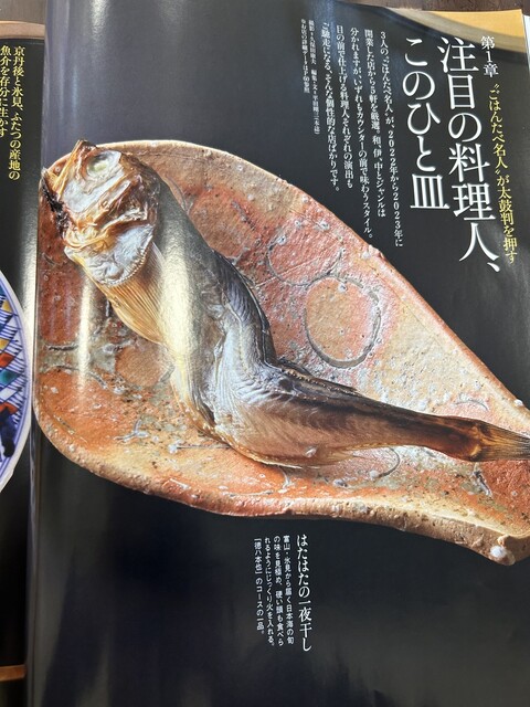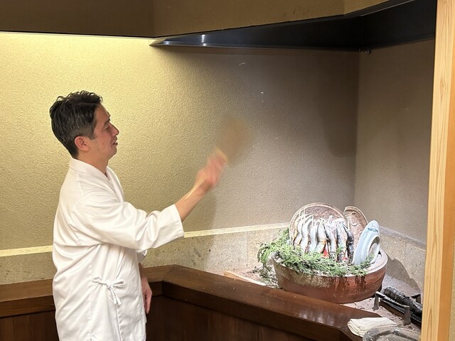 伊賀焼の作家・辻村塊氏の大鉢に炭を立てて魚を焼きます☆