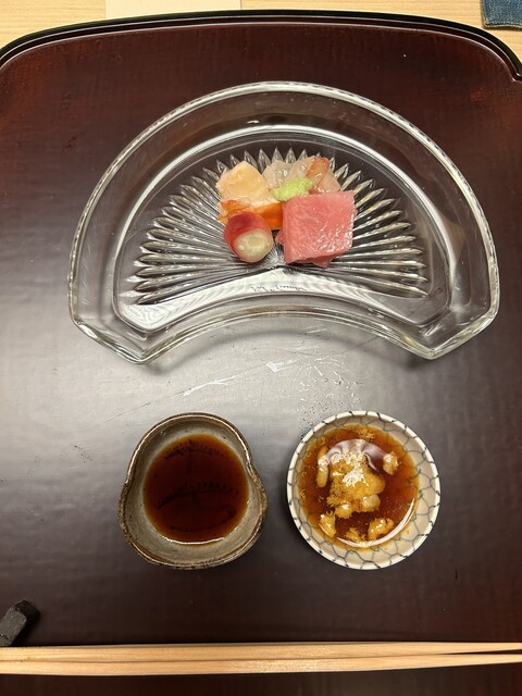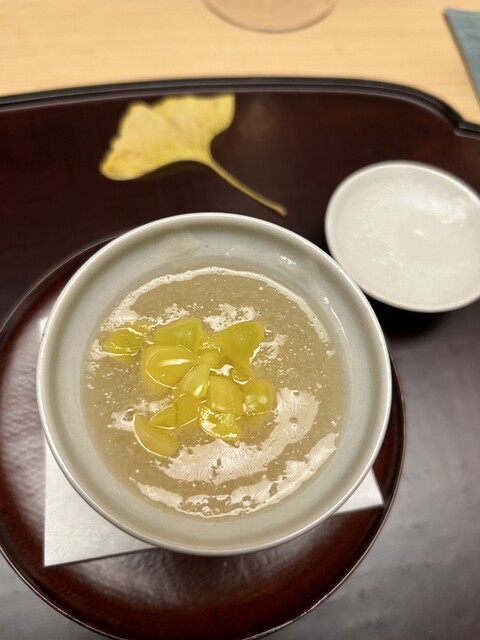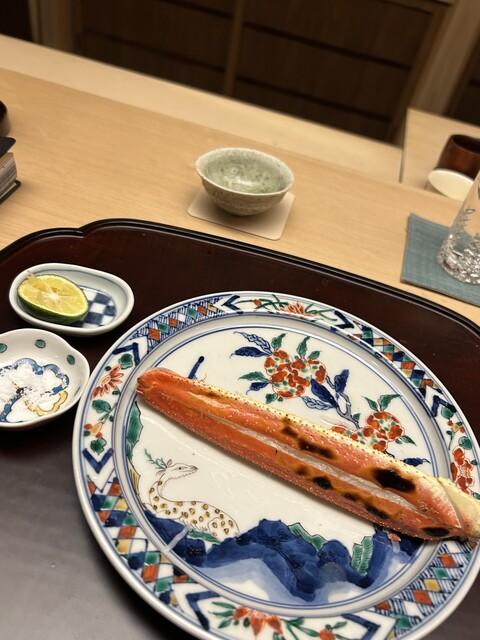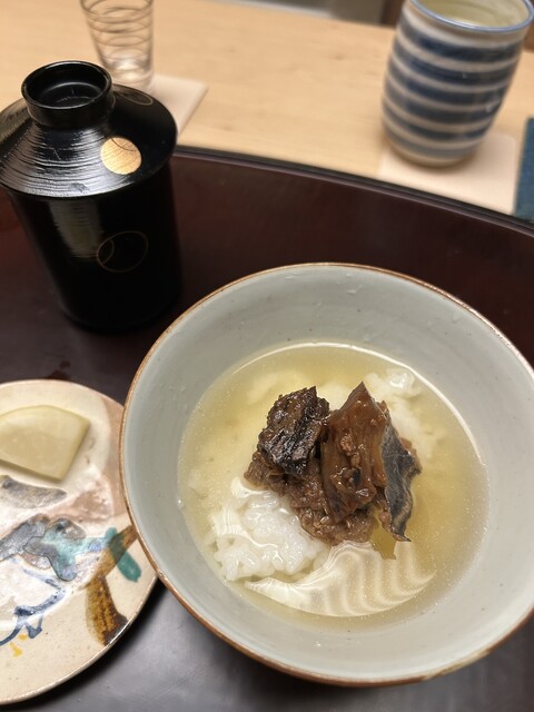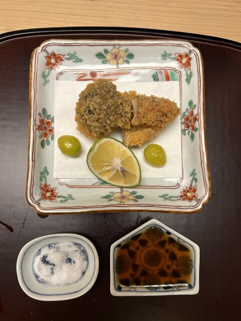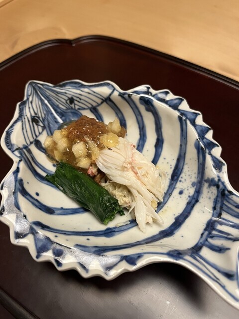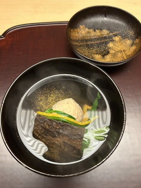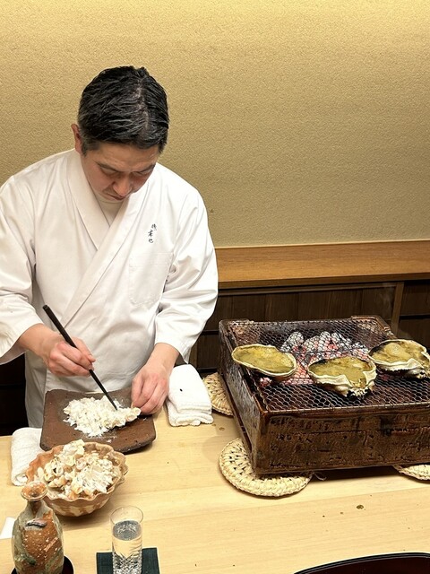 鮑の肝醤油、賀茂茄子の煎餅焼き、赤酢タレ