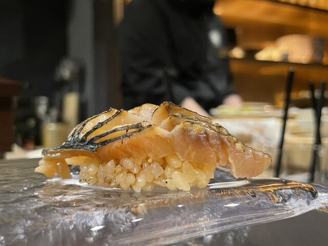 綺麗に包丁を入れた後に炙っているので立体的で見た目も美しい。香ばしい香りがたまりません。見た目のためでなく、しっかり包丁で小骨を処理しているのはさすがです。