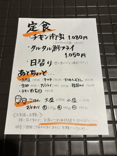 小倉駅周辺で美味しい店を探していたら見つけた。なぜチキン南蛮が小倉で?と思ったが百名店に選ばれるなら間違いないと訪問。店内は外観と反対にオシャレできれい。柔らかいチキン南蛮はサクサクふわふわ衣にたっぷりなタルタルソース。しかもゆで卵もぎっしり。味付けとろろも、米もうまい。米はどこのだろう。炊き方もあるかもしれないが、久しぶりにうまいご飯だった。チキン南蛮も噂以上に美味かった。メニューにあったごはんのあて、アジフライも気になる。