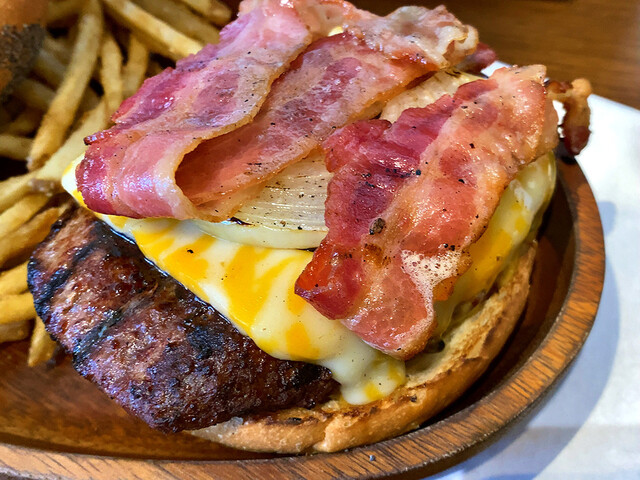 カリッ!フワッとした香り高いバンズ、シャキッとしたレタス、サッパリ・ジューシーなトマト、ジャキっと食感のオニオンソテー、スモーキーなベーコン、コクがありながらもさっぱりとしたコルビージャックチーズ、そして炭火の香ばしい香りをまとった、ジューシーな肉厚パティ。