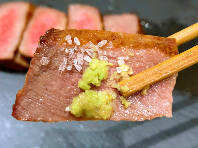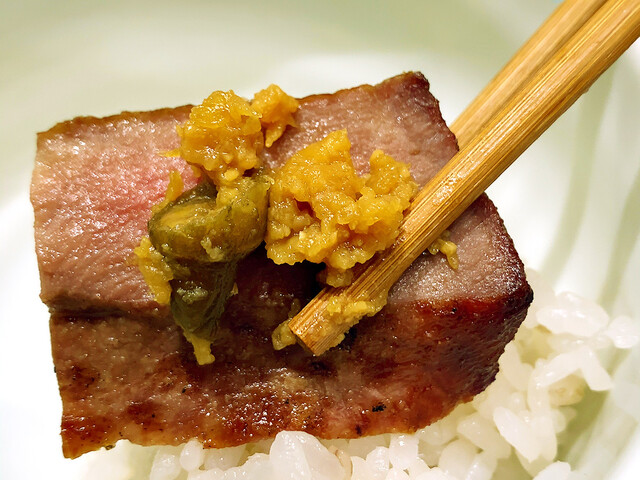 牛たんの甘みのある脂とわさびが合わさることで、何とも贅沢な旨みが広がり、さっぱりと食べることができます。