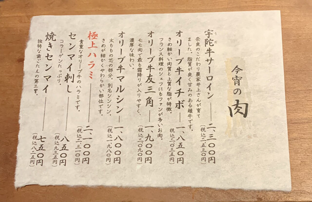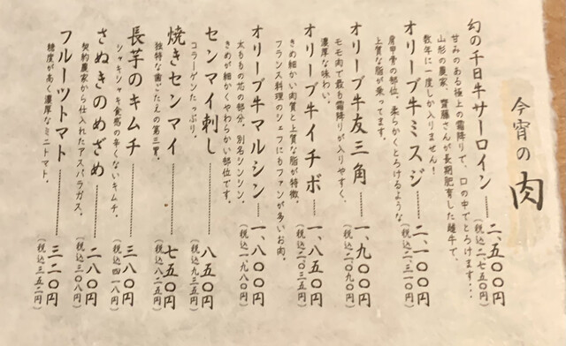 ひと通り定番メニューをいただいたあと、今宵の肉(おススメ メニュー)より、"オリーブ牛 友三角"と"オリーブ牛 ラムシン"を!!