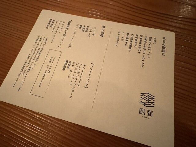 当日はカウンター席へ。臥薪のおすすめメニューがいただける飲み放題付きコースを堪能しました。入店時から賑わっていましたが、ほどなくして店内は満席に。地元でも支持される人気店であることを実感します。