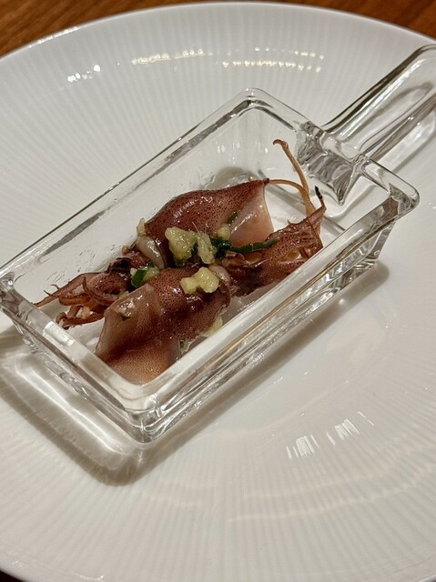 アミューズのホタルイカは、特製ネギソースが爽やかに香り、素材の旨みを引き立てる一皿。