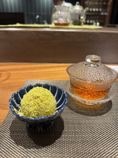 ピスタチオの白玉にマンゴーソース。とろけるような食感とプーアール茶で〆。