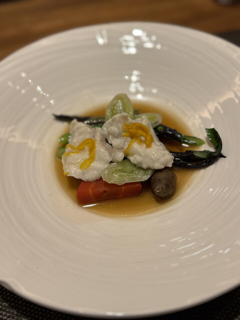 虎魚の繊細な白身に熟成陳皮の香りを添えて。骨から取った出汁が絶品。
