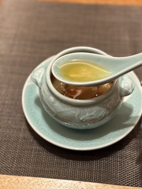 吉切鮫、衣笠茸、干し貝柱、天白椎茸。素材の旨みが凝縮された、店の真髄とも言える蒸しスープ。