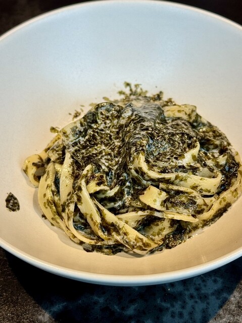 選べる本日のパスタは、柚子胡椒のきいた海苔のタリアテッレ。磯の香りと爽やかな辛みが締めにぴったり。