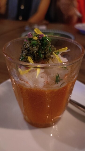 グラスの中に美しく盛られ洒落ていて、上にはキャビアのようなとんぶりがたっぷりと置かれ、ソースは甘みも感じながら酸味が上質でかなり美味しい♪