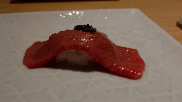 和牛のユッケに自家製のマロン(栗)が乗り、ナッツソースのムースが美味しく、もちろんユッケが柔らかくかなり上質で美味しい♪