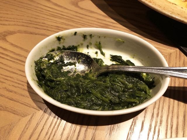 なおスタッフさんにより、お皿の上には付け合わせで別途注文したクリームドスピナッチ(ほうれん草のクリーム煮)が添えられています。これを箸休めにしながら、熟成肉ステーキをゆっくりと味わっていきました。
