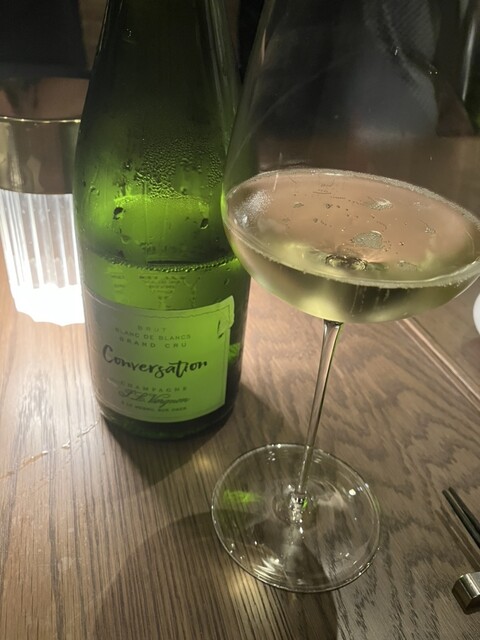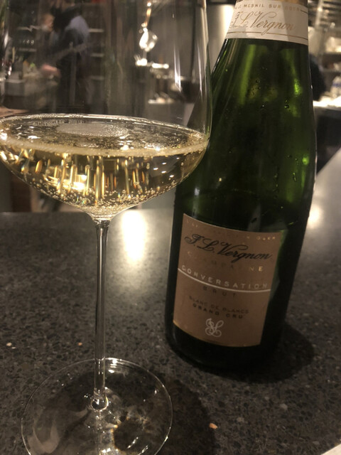 最初これなら5杯以上飲まないともったいないって計算かぁ、むしろ他の白ワインや赤ワインも楽しみたい気もするけど・・・って少し戸惑うが、実際一杯目に飲ませてもらったpierre paillardがものすごく美味しくてあっという間に飲み干しちゃったことと、アラカルトで頼んだものがどれもシャンパンとあいそうだったので、当初の予定通りフリーフローを楽しむことに。