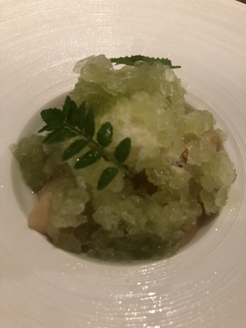 冬瓜って言ったかな?上に乗ってるのは漬物?塩っけとシャキシャキした食感が楽しい。