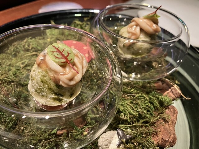 今回は季節の食材を使用したフルコース¥7700+メインピジョンラミエに変更¥1850+ワインペアリングフル5杯¥7950