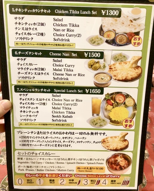 (サラダ、ナンorライス、マライティッカ、チキンティッカ、シークカヴァブ、チョイスカレー2種(10種より)、ドリンク)