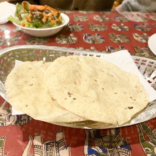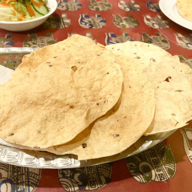 パパドは美味しいおせんべい。今日も我が家のために色濃いめ!!ありがたい!持ち帰りをお願いしました。