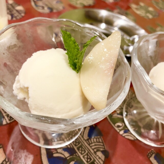そしたら、今日のフルーツは梨でしたがたっぷりのせてくださいました。