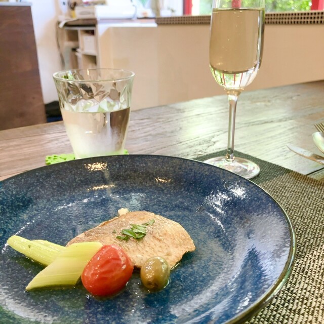 鯛を軽くソテーした後に、オリーブとトマトと一緒に少量の水で蒸し焼きにしたような料理とのことでした。