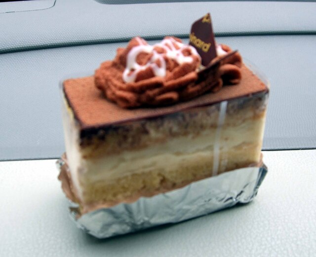 この美味しさを人に伝えたくて、昼休みを利用してわざわざ店に行っちゃいました。箕面の駅の近くである。店に入ると、まずはショーケースに飾られたカットケーキに目が行く。いかんいかん、目指すは夏トリュフ。ありました。早速5箱注文すると、お店の方が保冷剤も必要で、大変な量になると。車だから平気ですよ。しかし、実際に渡された品は大変な量であった。落ち着いてショーケースを見ると、美味しそうなケーキがずらり。そこで、車の中でいただくべく、3種類のチョコが入ったケーキを購入。それがなんと310円。めちゃめちゃ安い!そのケーキ。チョコ、ホワイトチョコ、ビスキュイジョコンド(コーヒー味のチョコ)がたっぷりと3層になっている贅沢ケーキで、またこれが美味しいこと美味しいこと。オペラやザッハトルトと肩を並べる逸品です。